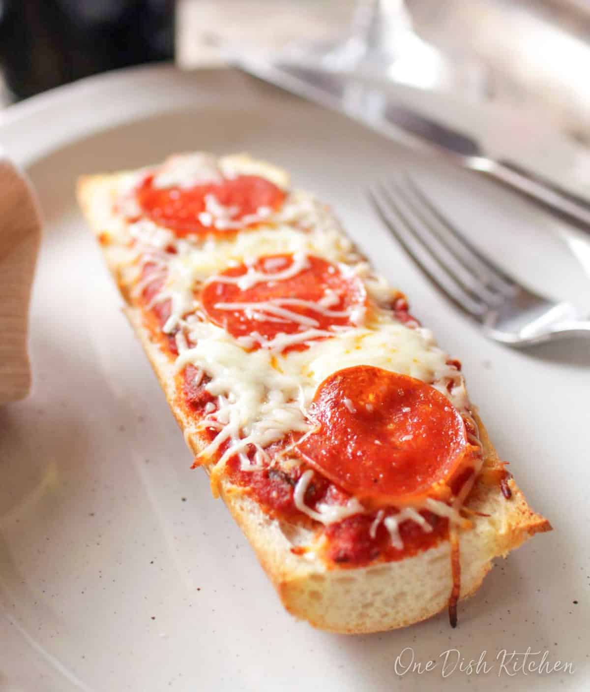 This French bread pizza for one is a quick, easy way to enjoy a homemade pizza without making dough. Soft French bread is topped with sauce, mozzarella, and pepperoni, then baked until the cheese is melted and the edges are lightly crisp.