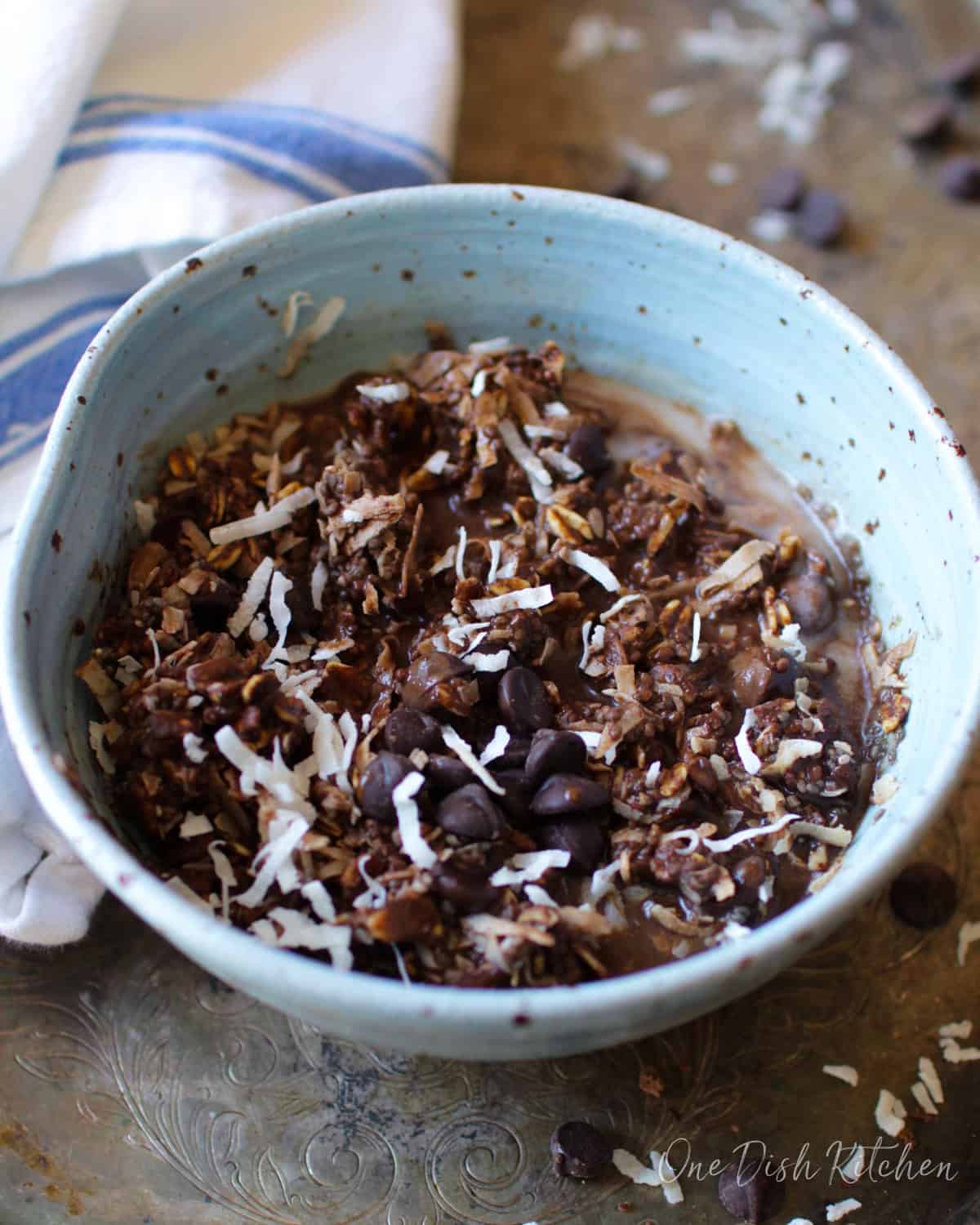 - Stir the cocoa into the cooked oats. Divide the oats into two bowls and add the chocolate chips, coconut, chia seeds, and maple syrup.