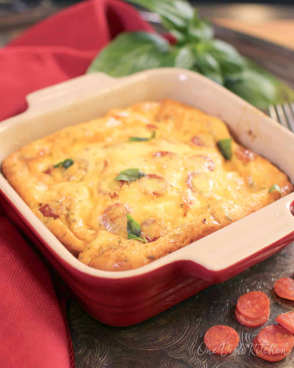 I cut the recipe in half, used diced canadian bacon rather than the pepperoni and skipped the Italian seasoning. Baked in a ramekin, perfect delicious breakfast for one.
