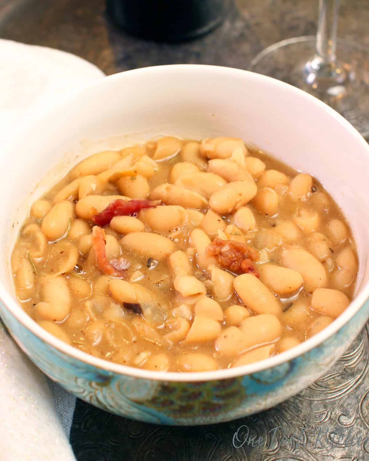 - Gently mash some beans against the side of the pot to thicken the soup. Ladle into a bowl and top with the reserved bacon.